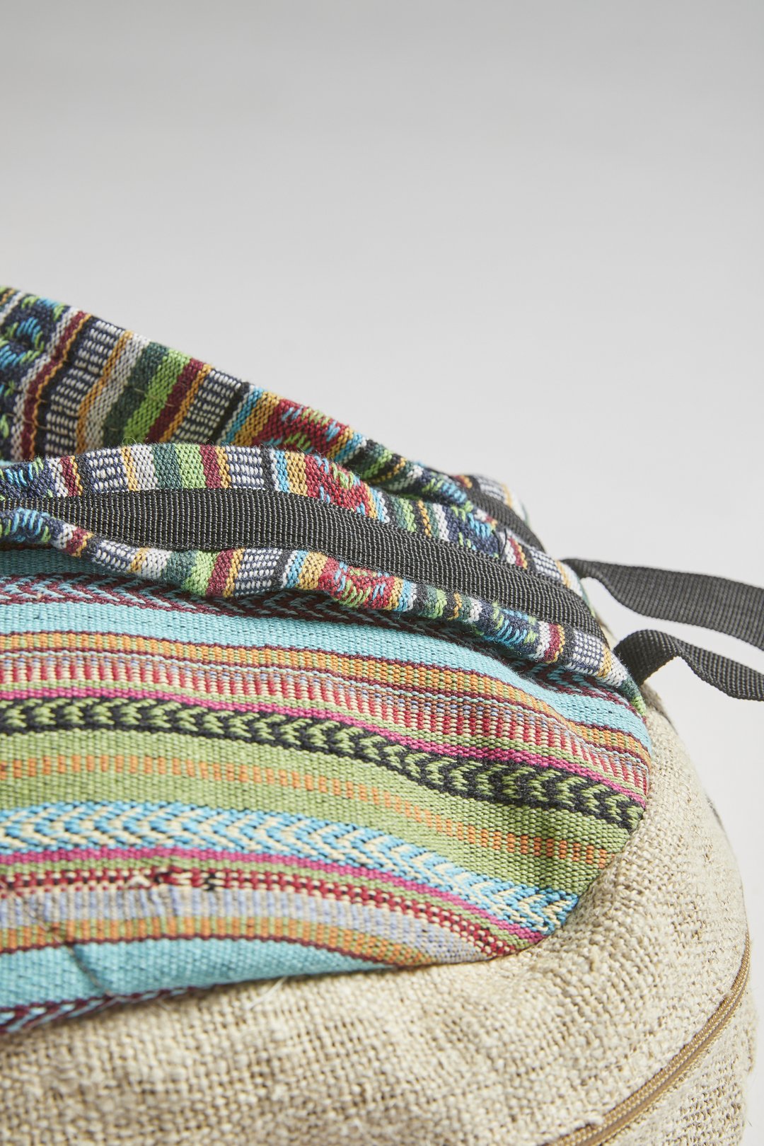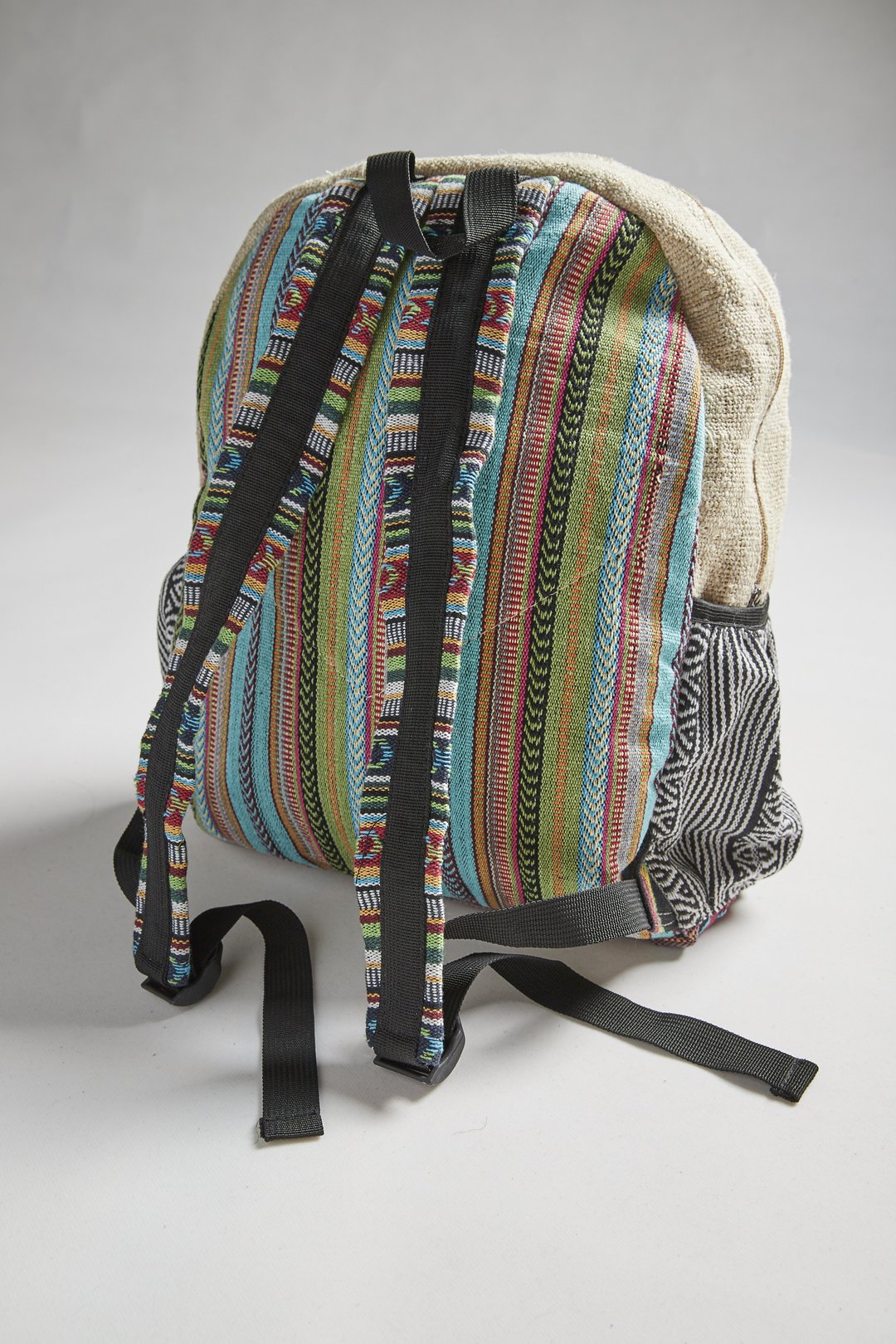 Bohemian style backpack handcrafted in Nepal using a mix of wild hemp, stone washed Gheri cotton and canvas. With lots of pockets and features the handmade process of this heavy duty backpack produces variations in colour fade adding to the unique nature of each one – genuine YKK double zipper and runners.