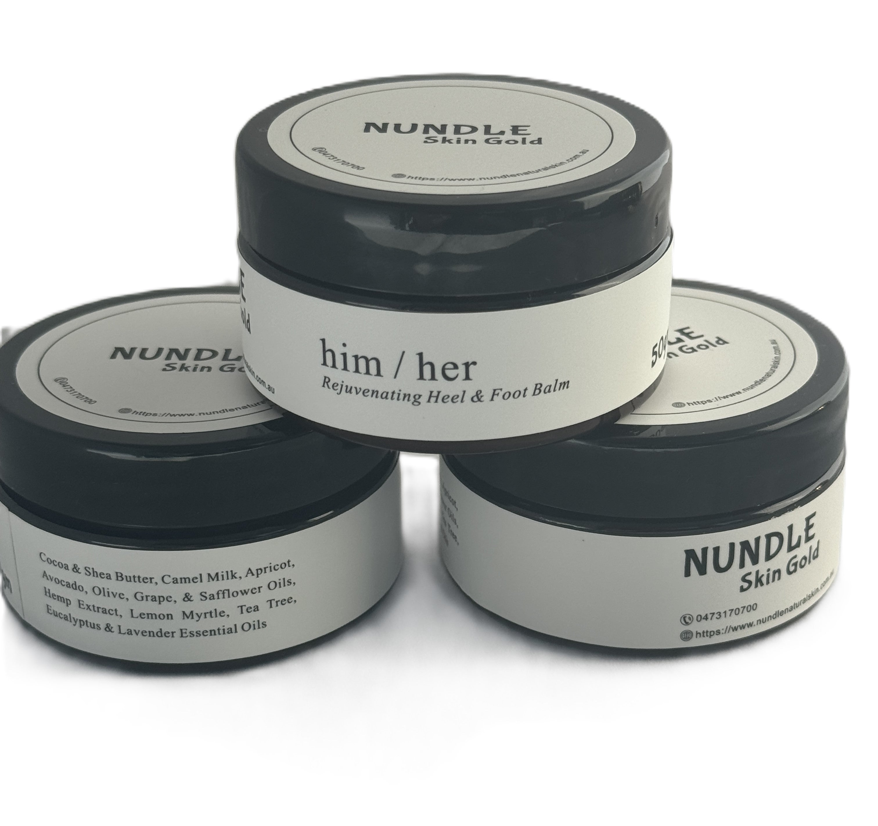 The Rejuvenating Heel and Foot Balm has natural ingredients including Cocoa & Shea Butter, Camel Milk, Apricot, Avocado, Olive, Grape, & Safflower Oils, Hemp Extract, Lemon Myrtle, Tea Tree, Eucalyptus & Lavender Essential Oils